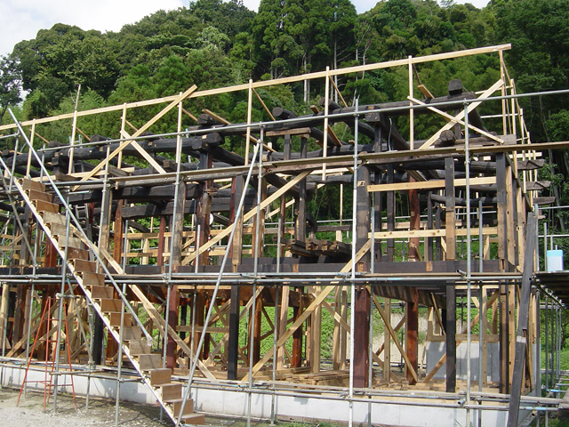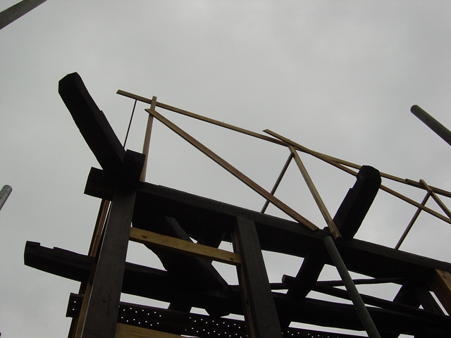 屋根を作るための足場が組まれ、簡易階段も出来ました。