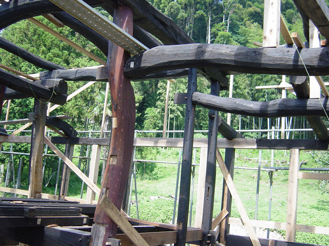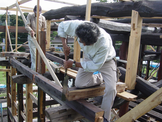 棟梁をはじめとする大工さんたちは、屋根の材を刻んでいます。