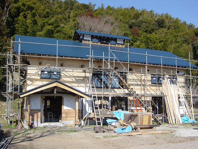屋根が出来上がり、壁面には断熱材が入り木工事が着々と進んでいます。