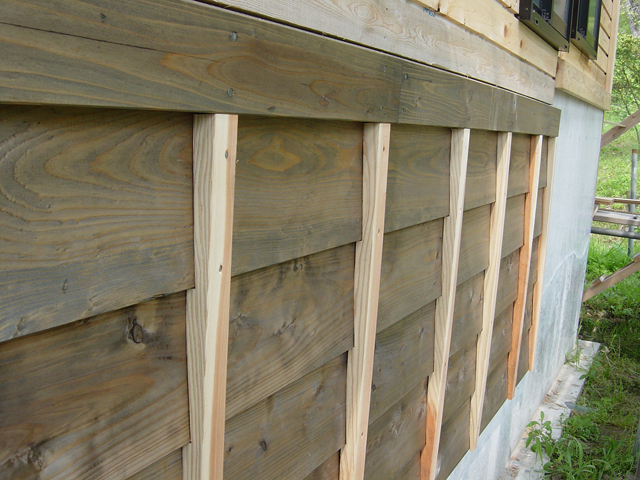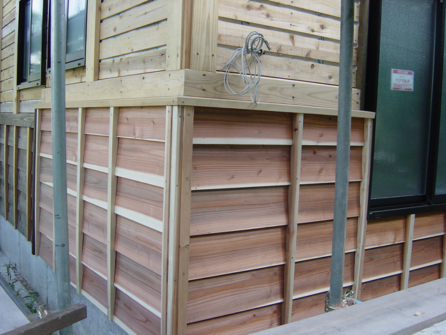 コンクリートの面と 外壁の間に空間を作り、かつ 湿気に強い赤味板を配置しました。