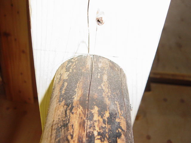 でも 両端の柱が出来上がってからこの手すりが取り付けられたから、両端に凸がある丸太をはめ込む事は 不可能だし。。。。