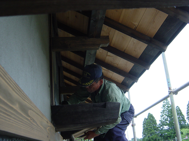 狭い足場の上に 軒が長いので いつものつもりで頭」を上げると 「おっとっと 危ない!」または「ゴツン いて〜な」という事になります。