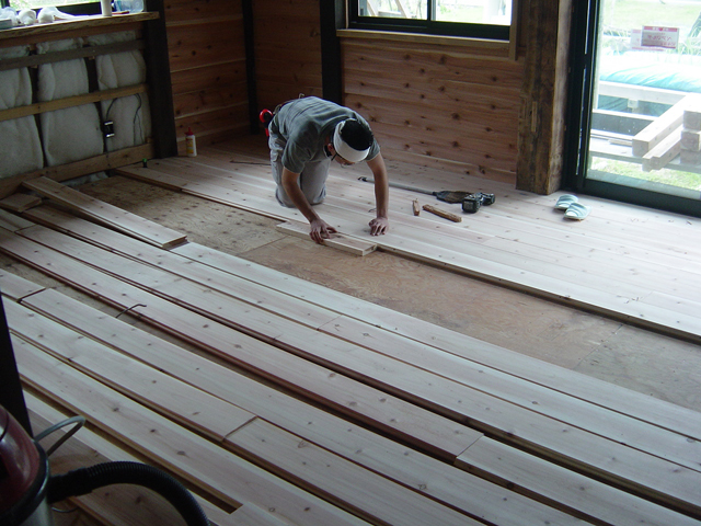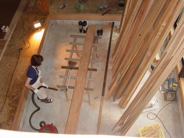 どんぐり庵でも 床張りが始まったと報告すると、「ヒノキは 冬素足で 床に触れると冷たい感じがします。そのてん スギは肌触りがもう少し暖かいでしょうから、正解でしょう。」という 答えをいただきました。