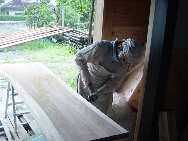 それを見た棟梁は 「そうじゃなくて(棟梁はダメという言葉を使いません。いつも そういうやり方もあるだろうけれど・・このことばから始まります。) 奥さんが使っていたノミを持ってきてください。」こういわれ 早速もっていくと ノミでわずかに剥がし口を作って そこにあて板をして トントンとたたき 見事きれいに あっという間に剥がし終わりました。