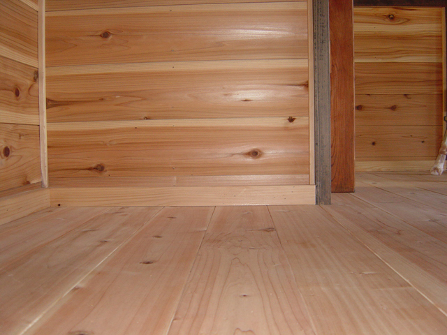 年代を経たどんぐり庵の材と 床や板壁の新材と バランスをとるために柿渋一回塗りを終えてから、キヌカの塗布を始めました。